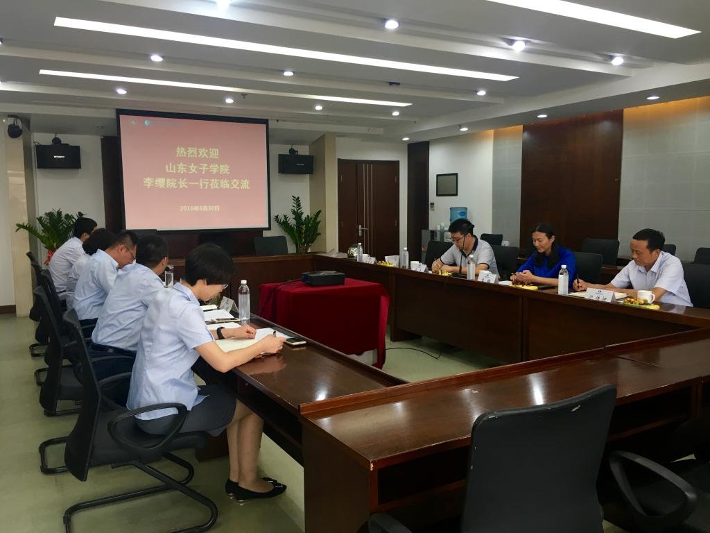 国泰君安证券股份有限公司山东分公司副总经理刘程首先向我院教师介绍了公司的历史沿革、组织架构、主营业务及荣誉成就;公司实习生负责人李玉倩就我院学生2016年暑期实习情况进行了总结,对我院38名金融工程专业的学生在实习期内的表现给予了肯定;李缨院长与冯亮老师就实习基地深度合作方向、本科评估期间实习基地考察安排及外聘讲师等事宜同公司进行了沟通交流。