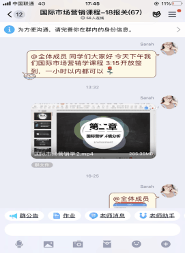 考虑到直播教学方式对网络的要求较高,并且大学数学知识点在讲解的过程中,逻辑性衔接极为重要,稍有卡顿课程讲解将大打折扣。因此,像韩李芳老师《国际市场营销》课程,运用视频录播形式,通过自己录制教学视频来讲解内容,有利于学生对于教学内容的学习和掌握和反复观看。同时,为了防止学生在电脑前学习时间过长而导致疲倦,还会会间隔的带领大家回顾知识点。对学生课下的检查作业、“约谈”同学也是毫不含糊,确保每一节线上教学课程的质量。