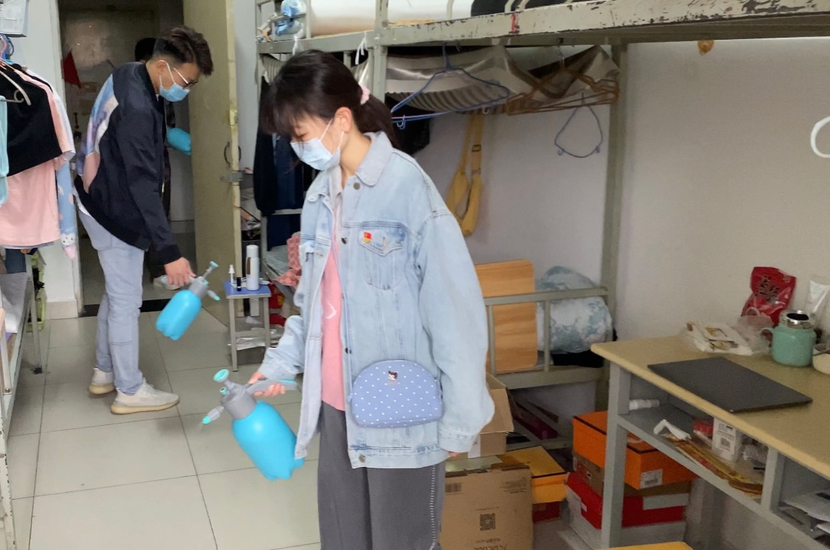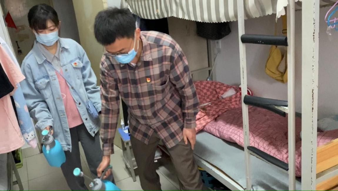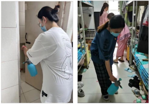 党员志愿者提前准备好消毒物资,按照宿舍等公共场所的消杀规定,使用消毒液进行喷洒消毒,同时宣传疫情期间保持宿舍良好卫生环境的重要性。党员们认真仔细,不放过任何一个角落,实现了宿舍消杀全覆盖,以同劳动、共抗疫的方式,为巩固学院疫情防控成果贡献力量。活动结束后,党员同志们主动将消杀的图片发至支部群中相互检查,在大家的共同努力下,宿舍环境焕然一新。