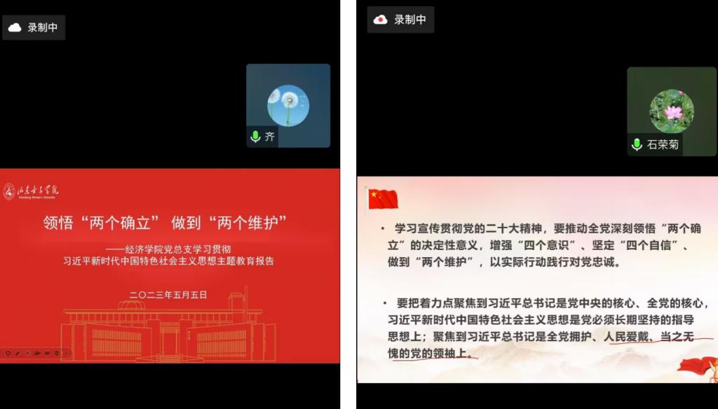 2023年5月5日晚上,经济学院党总支通过腾讯视频会议的形式,召开学习贯彻习近平新时代中国特色社会主义思想主题教育报告会,由马克思主义学院副院长石荣菊教授做主题为《领悟“两个确立”做到“两个维护”》的专题报告,学院全体师生党员参加会议,会议由经济学院党总支组织委员、副院长、教工第一党支部书记冯亮同志主持。