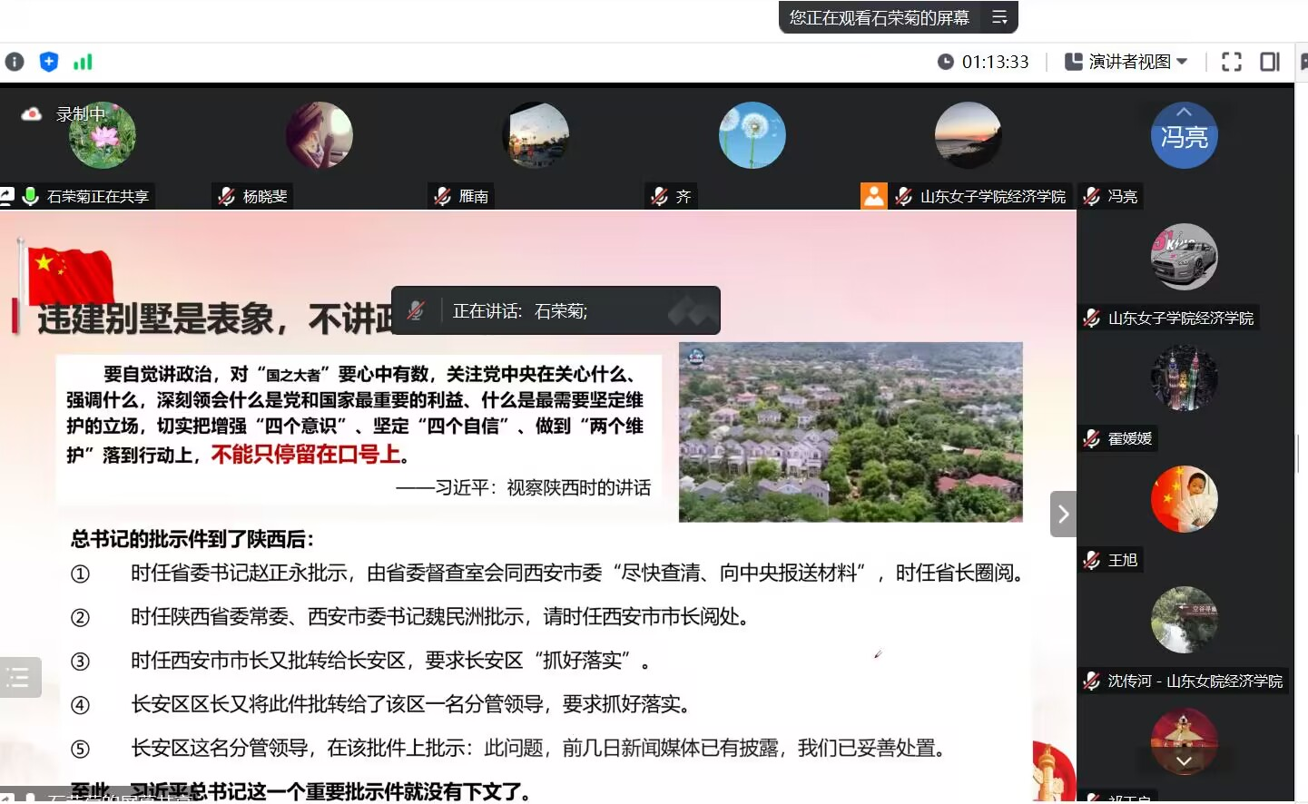 最后,石荣菊同志指出一个国家、一个政党,领导核心至关重要。确立习近平同志党中央的核心、全党的核心地位,确立习近平新时代中国特色社会主义思想的指导地位,是时代呼唤、历史选择、民心所向。