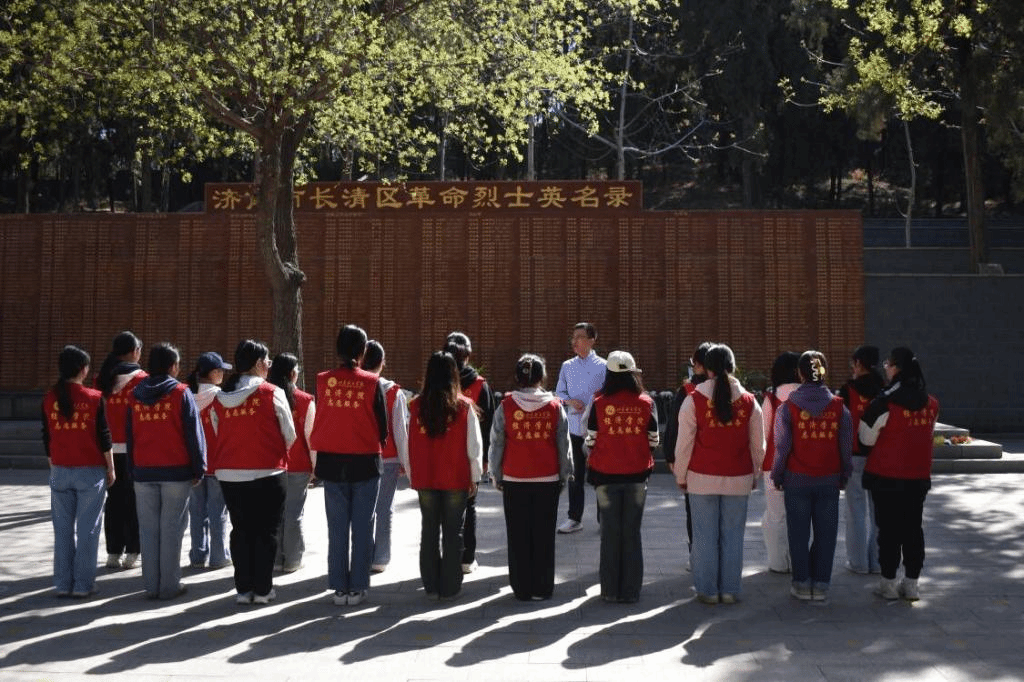 入党积极分子们来到了长清区石麟山革命烈士陵园,杨辰兴同志为大家讲述了陵园从无到有的风风雨雨,并勉励入党积极分子要从先烈的事迹中汲取营养,不断砥砺前行,为社会为国家贡献自己的青春力量。在庄严肃穆的革命烈士纪念碑前,同志们怀着崇敬的心情,向长眠于此的革命烈士鞠躬,向先烈们表达深切缅怀和最崇高的敬意。追寻着先辈的足迹,同志们参观了革命烈士纪念馆,一张张极为珍贵的史料照片,一桩桩革命英烈的英勇事迹,触动着每一位学子的心弦。参观结束后,杨辰兴同志带领入党积极分子对陵园进行全面细致地清扫。在庄重肃穆的氛围中,俯身于墓碑前,细心擦去每一块无名烈士墓碑上的浮尘,认真清扫墓园里的每一处枯枝落叶,身体力行地实践着“奉献、友爱、互助、进步”的志愿服务理念,以实际行动表达对革命先烈的深深怀念与崇高敬意。