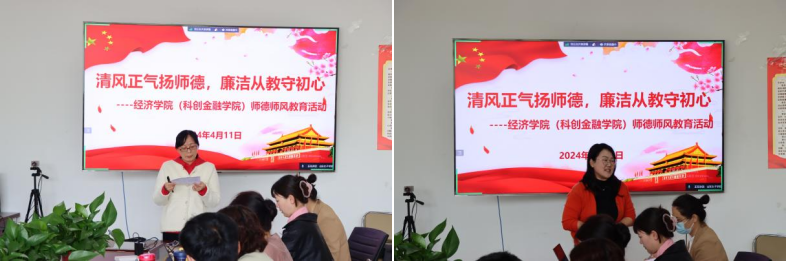 为了更好地践行教育使命,提升教师的职业道德水平,2024年4月11日,经济学院在求真楼202会议室开展了“清风正气扬师德,廉洁从教守初心”师德师风教育活动,会议由党总支书记齐振花主持,全体教师参加。