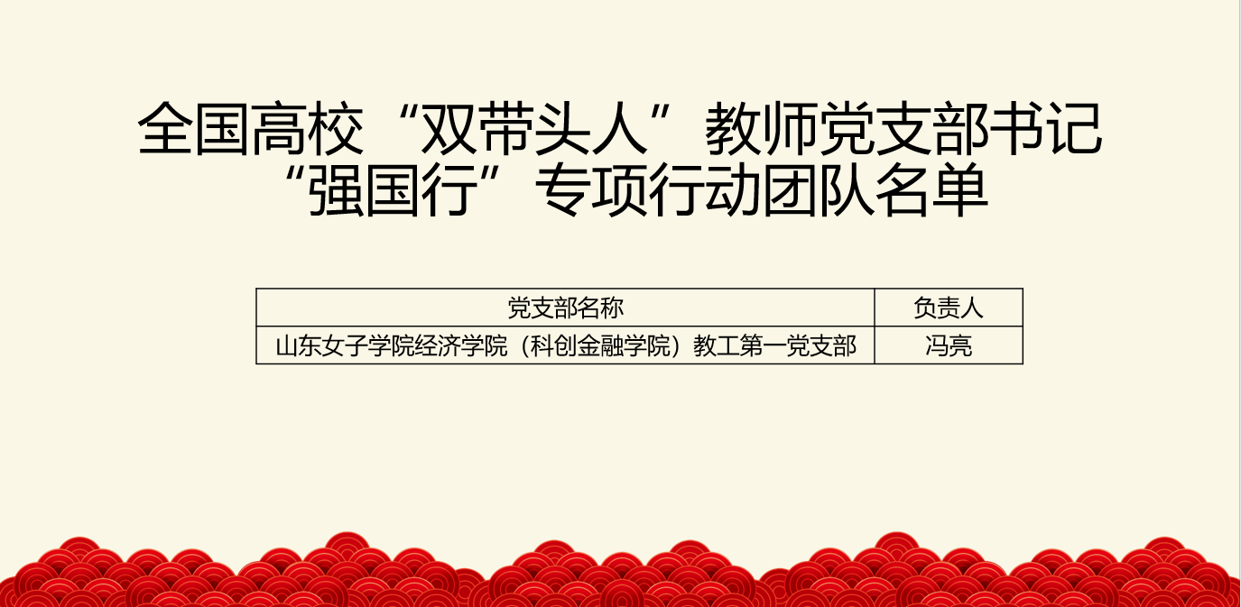 近日,教育部办公厅公布了全国高校“双带头人”教师党支部书记“强国行”专项行动团队名单,经各高校党委审核把关、省级党委教育工作部门择优推荐、专项行动办公室备案审核、结果公示,经济学院教工第一党支部成功获批全国高校“双带头人”教师党支部书记“强国行”专项行动团队。