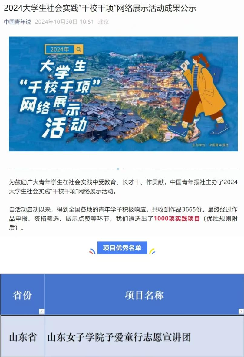 近日,2024大学生社会实践“千校千项”网络展示获奖名单公布。自活动启动以来,青年学子们积极参与,经过前期作品申报、资格筛选、网络投票、专业审查等环节,全国共遴选出1000项优秀实践作品。我院学生党支部成立的“予爱童行志愿宣讲团”成功入选,获评“全国优秀实践项目”。