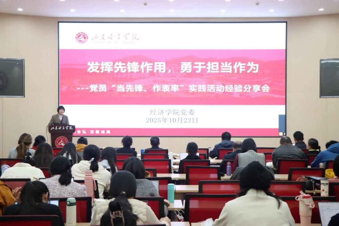 2025年10月23日上午,经济学院党委于求真楼报告厅召开全体教师党员大会,以“发挥先锋作用,勇于担当作为”为主题开展经验分享会,由学院党委书记齐振花主持,全体教师参会。