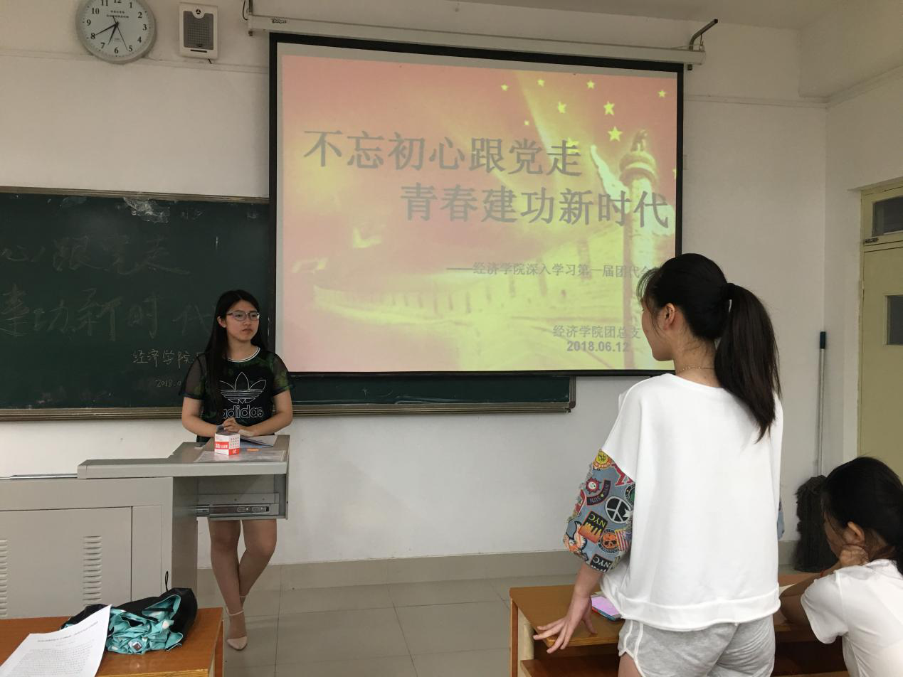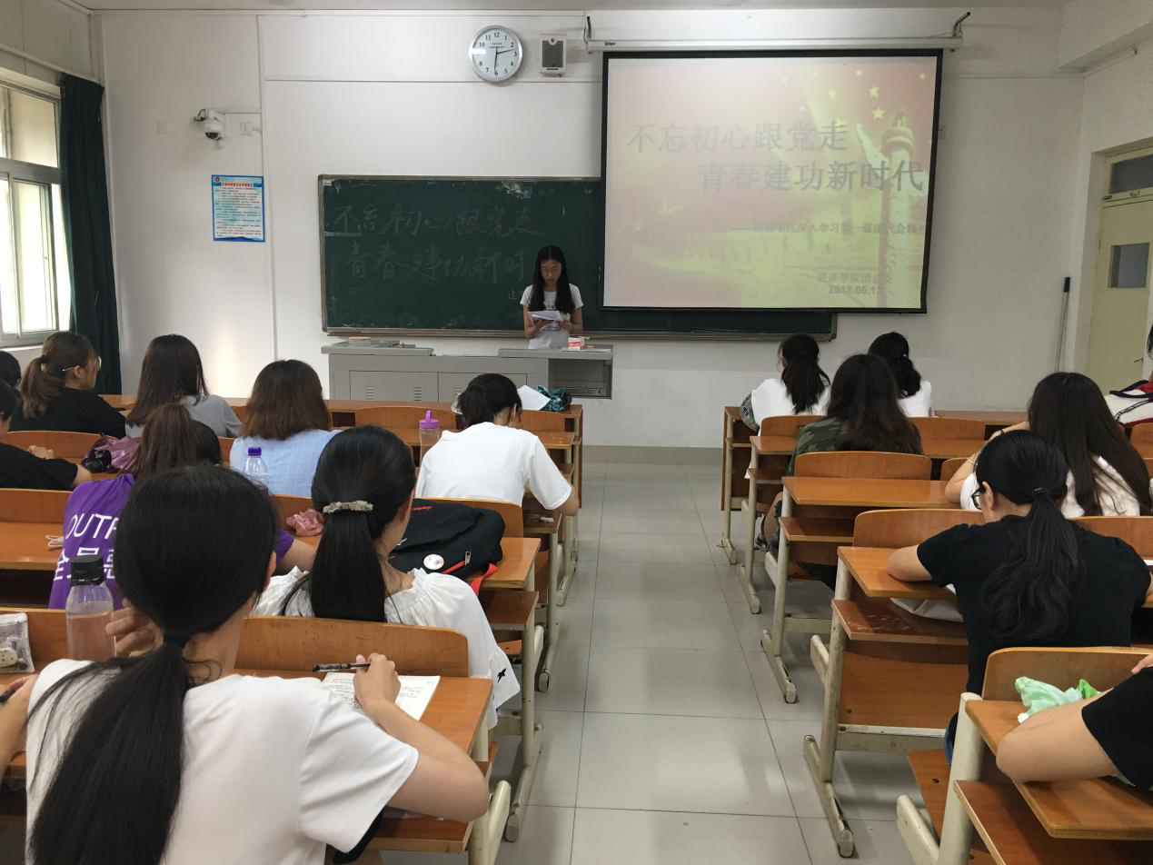 2018年06月12日下午六点,经济学院为积极贯彻落实我校召开的山东女子学院第一届团员代表大会上郭翠芬书记、王鲁书记的讲话以及致全校团员青年的倡议书,展开了主题为“不忘初心跟党走,青春建功新时代”的研讨学习活动。经济学院各班主要学生干部及积极分子和团代会代表参加了本次研讨会。