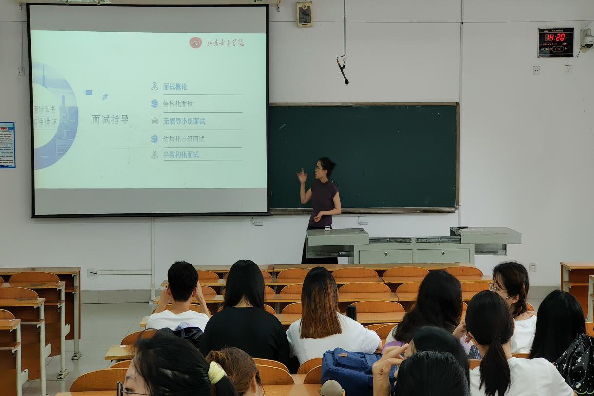 会议伊始,辅导员何老师从面试概论、结构化面试、无领导小组面试、结构化小组面试、半结构化面试,五个部分进行讲解。她强调面试是一种人事测评手段,测查的面试内容是应试者的能力和个性品质。紧接着,她为同学们分析面试中的不同的题目类型,讲解如何提高综合分析能力,又为大家讲述了新颖的小组面试形式与半结构化面试。最后,她鼓励同学们以积极的心态应对面试。