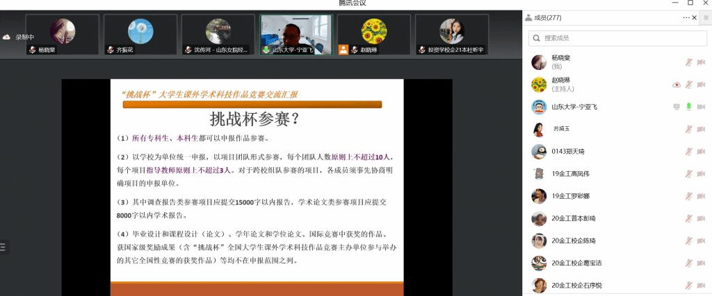 为积极培育科研项目,营造良好的学科竞赛氛围,提高学科建设水平,1月15日下午,经济学院邀请山东大学宁亚飞博士对“挑战杯”赛事进行专题辅导。本次辅导通过腾讯会议线上举行,经济学院领导班子成员、全体教职工、“挑战杯”学生团队队长及骨干成员参加了会议,会议由党总支书记齐振花主持。
