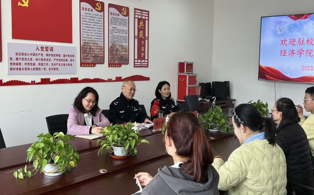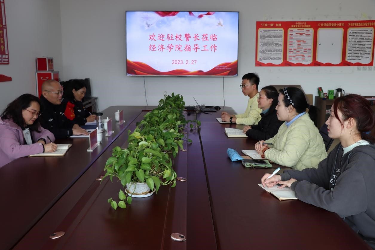 为了进一步筑牢校园安全屏障,营造和谐美好的校园环境,2月27日下午,驻校高级警长傅士勇、警长王华在保卫处副处长魏崇红的陪同下莅临经济学院指导安全工作,在求真楼202展开座谈,学院党总支副书记赵晓琳、团总支书记杨晓斐、安全员杨辰兴与学生代表参加座谈。