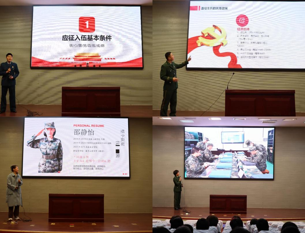 首先,由第一位分享人凌衍祺介绍应征入伍的基本条件,第二位分享人董天翔介绍退役士兵的优待政策,接着由第三位分享人许世龙为同学们讲解考取军官学校、继续服役的相关政策及绿色军营生活的点点滴滴。最后,由分享人邵静怡讲述了当兵的初衷及感悟,极大地激发了同学们的参军热情。