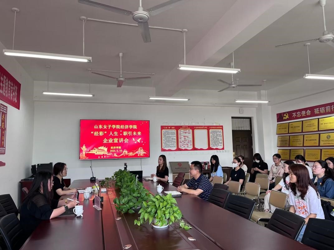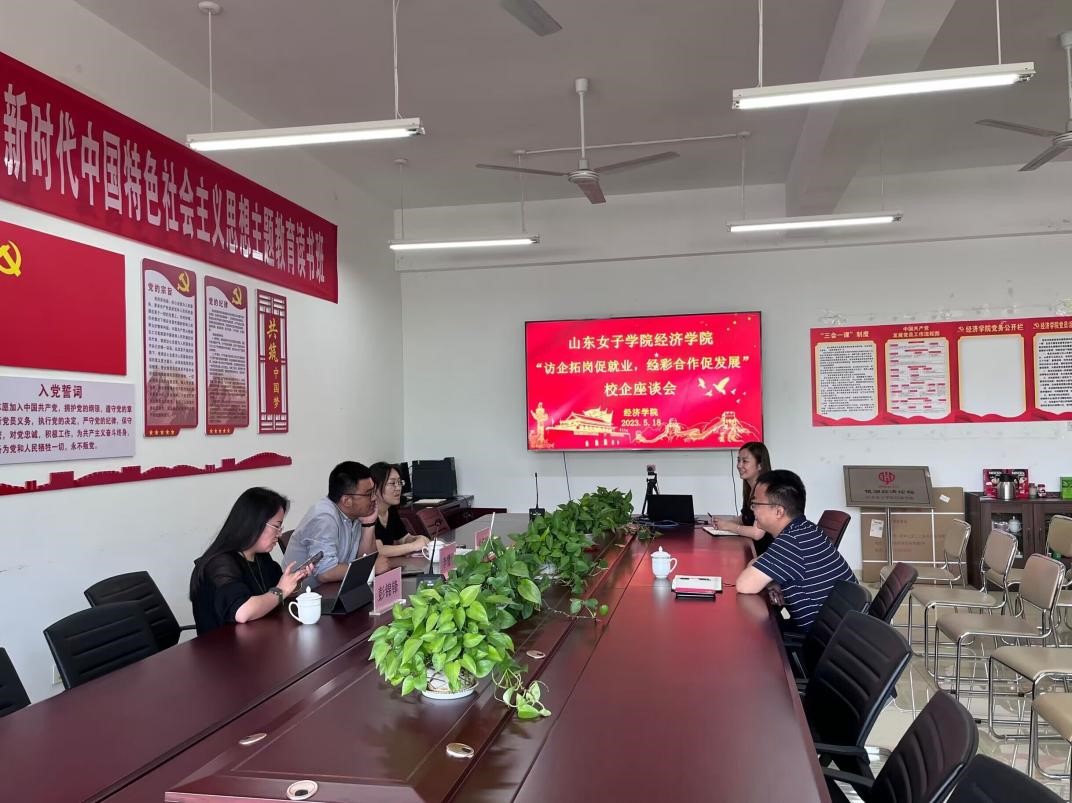为了贯彻落实政府“稳就业”、“保就业”政策措施,深入推进校企双方合作交流,促进实现企业与高校双赢目标,2023年5月18日下午,山东女子学院经济学院举行了“访企拓岗促就业,经彩合作促发展”校企座谈会暨“经彩人生,职引未来”企业宣讲会。会议邀请了山东联合竟成货运代理有限公司李懂善总经理、山东新佳怡包装有限公司彭锦锋总经理、济南广盛源生物技术有限公司孟雅丽总经理参加座谈会,经济学院副院长崔俊富、就业联络员老师张梦瑶出席此次会议。