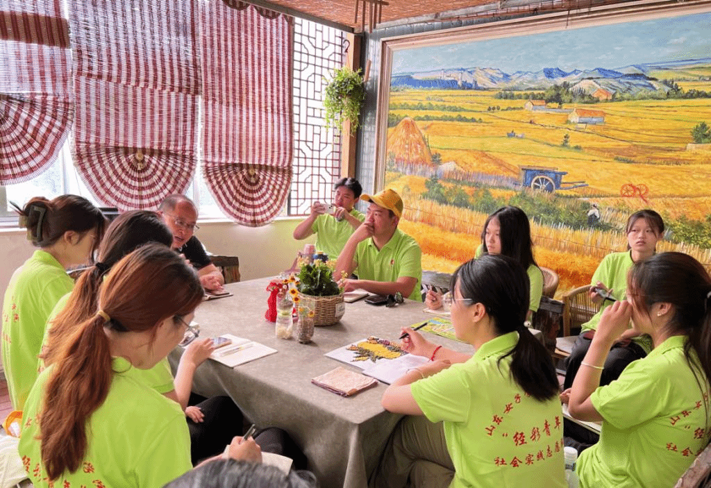 走进大陡崖村,村居院落交错有致,目之所及红瓦白墙、田间小道阡陌纵横,房前屋后绿树掩映,让人忍不住赞叹新农村新面貌。大陡崖村党支部书记杨力向“经彩青年”志愿服务队成员介绍了当地“和美乡村”建设理念,在乡村振兴的基础上,当地依托“德育乡村”建设,提高村民觉悟,培育文明乡风,深入推进文化和旅游产业深度融合,持续带动群体增收,加快建设宜居宜业“和美乡村”。在大陡崖村积极探索从实现“乡村善治”到“社会参与”再到推进城乡“共同富裕”新模式的进程中,“经彩青年”志愿服务队成员全身心感受当地建设成效,并充分发挥专业优势,为本地乡村旅游产品和线路创意、建设等各项环节建言献策,推动当地乡村旅游产业转型升级、打出品牌、增加收益,助力共富模式的落地实施。为“共富市集”提供创意方案,全领域、多角度、广应用打造共富场景,为积极推进大陡崖村成为青岛西海岸新区的“共富样板”贡献“青春智慧”。