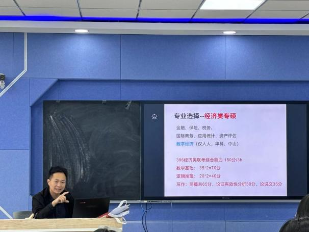 高远亮老师先从考研现状给同学们做了介绍,他指出近5年来研究生的报名与招生比大约在3.5到4,竞争比较激烈。高远亮老师专门针对经济学院学生可选择的考研专业及院校给学生进行了全面系统的介绍,分析了合理选择报考院校和专业的重要性,使同学们对考研有一个整体的把握。高远亮老师着重对考研数学的数一、数二、数三、396经济类联考和199管理类联考做了详细的介绍,他强调同学们一定要根据自身情况选择数学和396经济类联考的考试科目,科目不同考试的难度大不相同。他也对考研英语的复习给大家进行了讲解与指导,强调英语的学习需要多读多练,寻求语感。最后,高老师给同学们分享了很多成功上岸的案例,鼓励同学们根据自身情况合理选择专业及院校,不畏艰难勇攀高峰,一举取得研究生考试的胜利。在答疑环节,高老师对学生进行了一对一详细的解答,同学们主动咨询,纷纷表示受益匪浅。