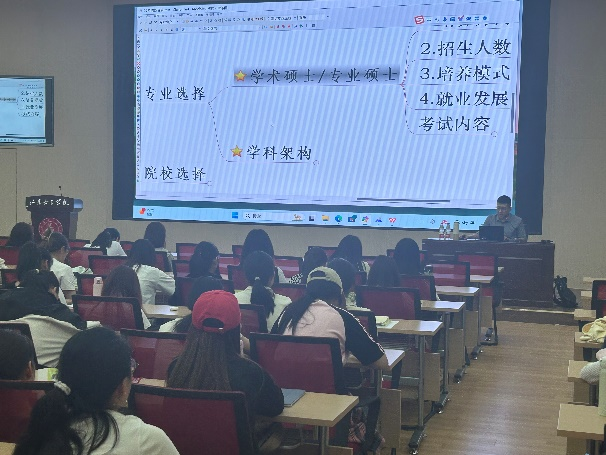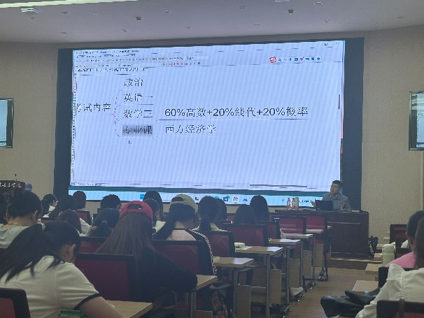 胡强老师讲解了考研的报名、初试、复试、调剂等基本流程,使同学们对考研有一个初步的认识。胡强老师分析了当前考研的形势,向同学们讲解了当前考研的难度,他鼓励同学们尽早了解考研相关政策信息,打有准备之仗,增加考研成功率。胡强老师就考研初试科目及考试内容给同学们进行了详细的介绍,使同学们对考研有更深一步的了解。胡老师还从考试科目、招生人数、培养模式、就业发展等方面对学硕和专硕的区别进行了详细讲解。最后,胡老师向大家讲解了经济学院考研往年报考走向,并强调了考研院校专业选择的方法技巧,使同学们了解本专业目前的考研现状。通过本次指导会,参会同学表示对考研有了更清晰的认识,将会吸取胡老师讲座中的知识,为未来的考研规划奠定基础。