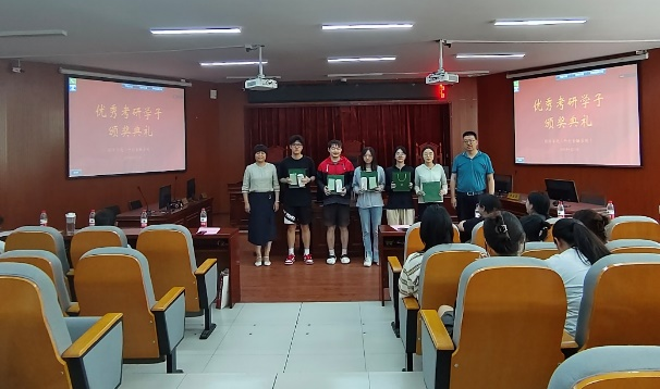 党总支书记齐振花、副院长冯亮为2024年考研成功被录取的学生代表颁奖,鼓励同学们继续努力,在以后的深造中取得更好的成绩。2024年经济学院有28位同学考取国内研究生,2位同学考取国外研究生,总考研率9.4%,较2023年增长了3个百分点。