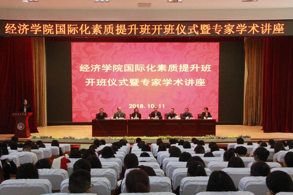 10月11日下午,经济学院国际化素质提升班开班仪式暨专家学术讲座在图书馆二楼报告厅举行。学校刘正林副校长、客座教授教师美国堪萨斯大学终身教授张建波博士、山东大学经济学博士后Azka Amin博士、教务处穆勇处长、国际交流处李云鹏处长出席,经济学院全体教师和学生代表共计三百余人参加了仪式。