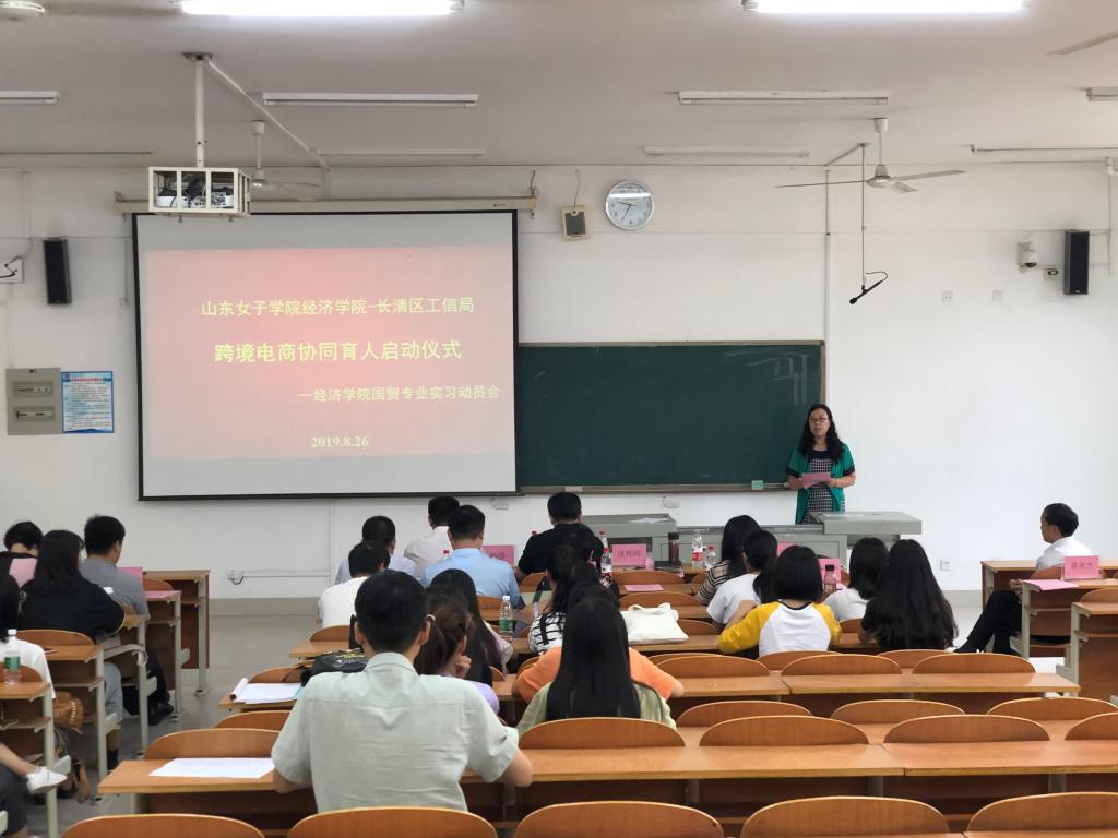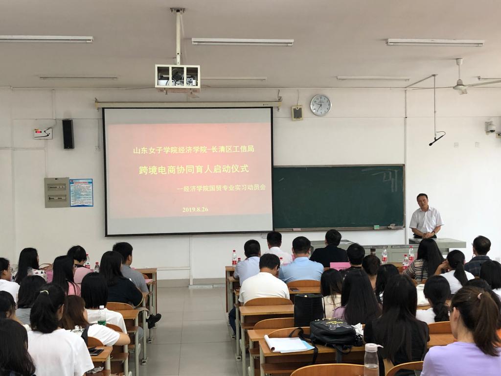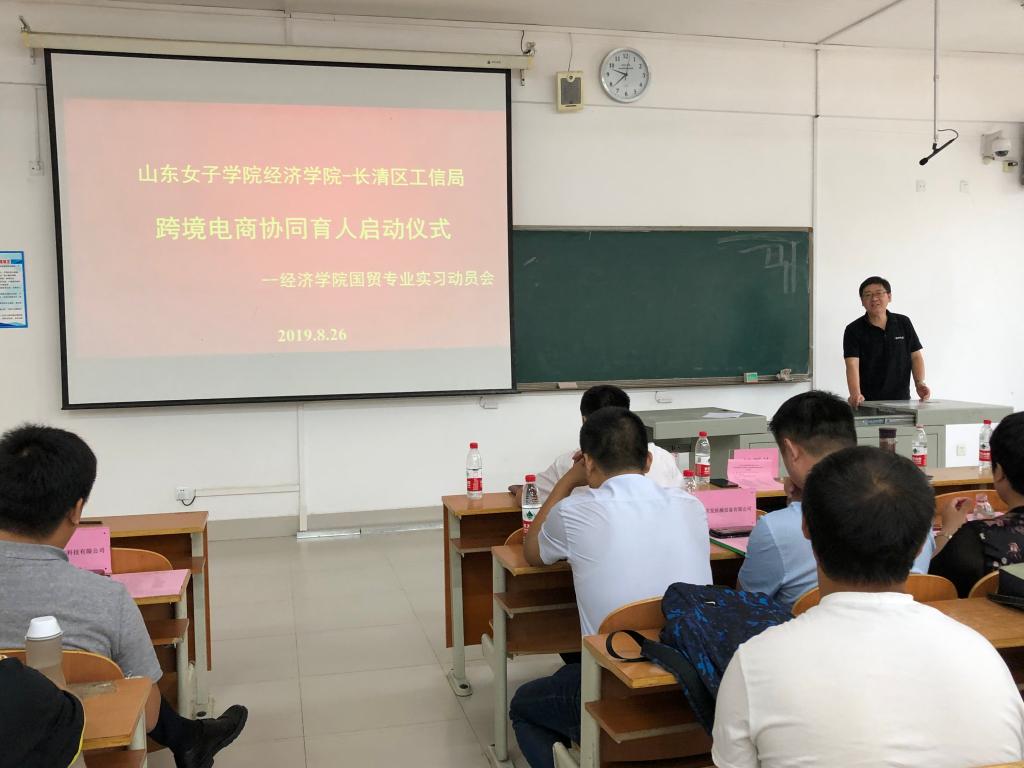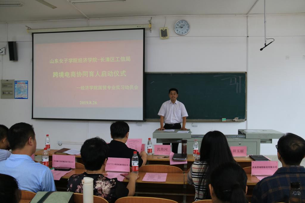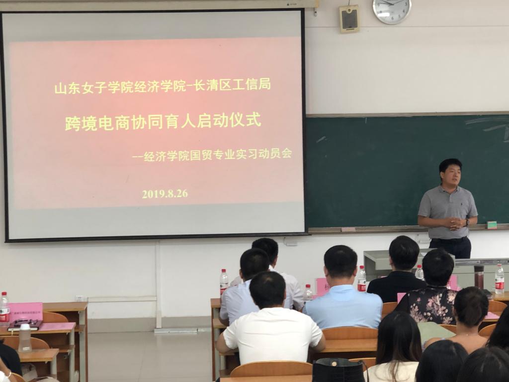 2019年8月26日上午,经济学院与长清工信局(商务局)跨境电商协同育人启动仪式在学校博文楼103举行,长清区工信局(商务局)闫新礼副局长、外贸科董来杰科长、学校科技产业处杨洋副处长、经济学院沈传河院长、田玉丽副院长以及长清区十家外贸企业的负责人和2017级国贸专业的学生参加了此次活动。