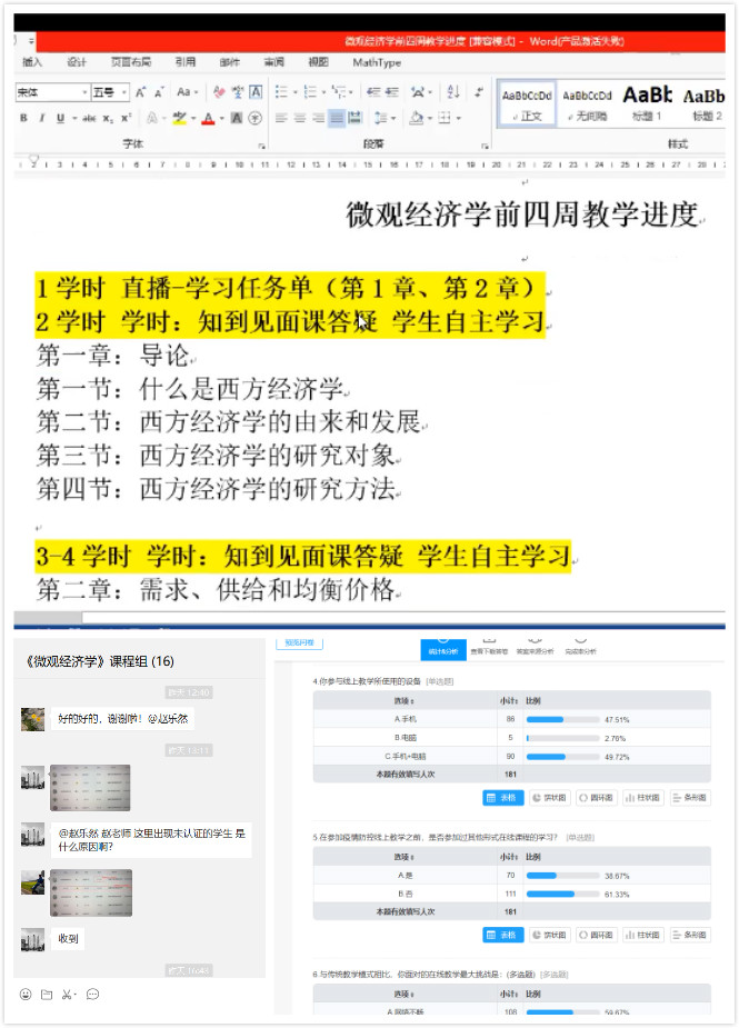 首先,重沟通,课程组在原有的微观经济学在线课程建设QQ群的基础上,建立了经济学平台课QQ群和微观经济学课程微信群,保障所有老师都及时了解课程改革方案和应急预案要求;