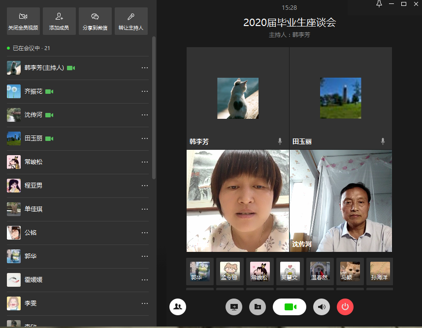 6月24日晚上19:00,经济学院2020届毕业生座谈会在腾讯会议线上举行,院长沈传河、副书记齐振花和副院长田玉丽出席会议,参加会议的还有5位教研室主任和毕业班辅导员。来自毕业班的12名毕业学生代表与学院领导和老师进行了一场真诚而深入的交流对话。
