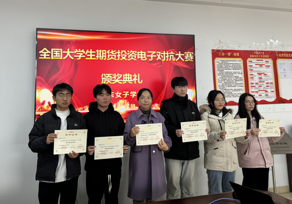 近日,经济学院举行第五届全国大学生期货投资电子对抗赛颁奖典礼。经济学院副书记赵晓琳、副院长崔俊富、指导教师沈旭与永安期货山东分公司经理王昊辰等企业代表出席此活动。