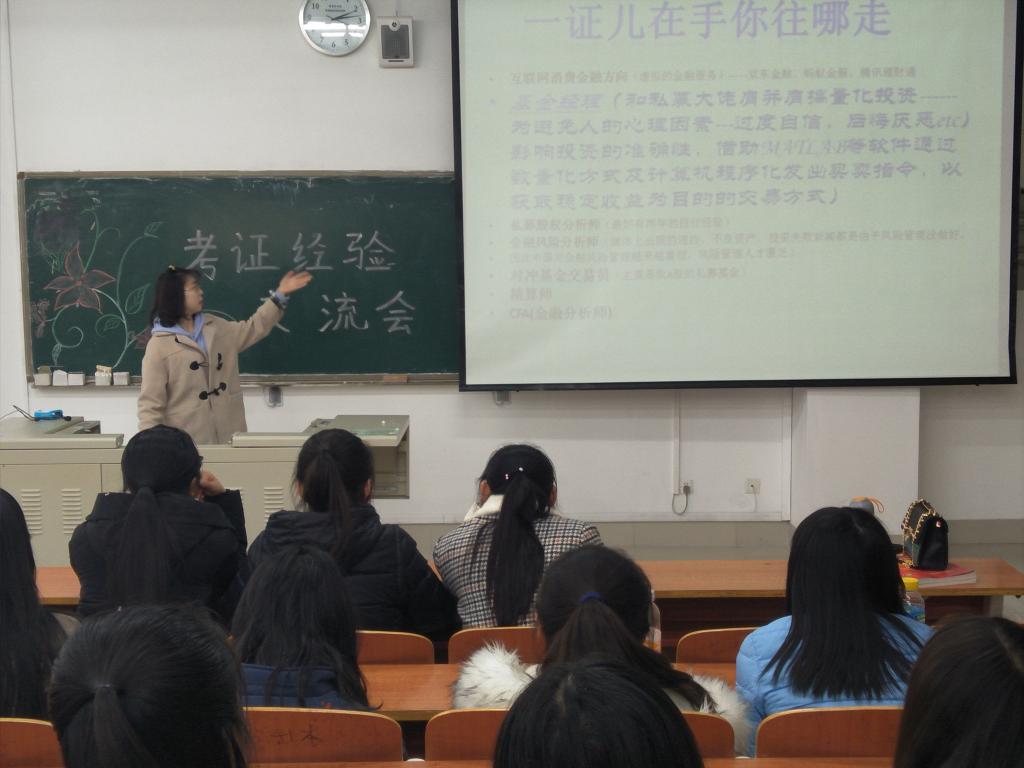 活动伊始,温春然老师就现如今金融的发展做出分析,强调证书的重要性并鼓励学生有选择的考取相关证书。随后,大三学生代表,纪晓慧同学讲述考基金从业资格证的经历,分享“万事俱备只差开干”的学习方法,介绍了“证书在手你往哪走”的就业发展方向。由大三学生代表李云霞就证券从业资格证和期货从业资格证进行详细的分析和解答,使学生了解了更多的相关考试科目及类型,同时对考试过程中的各种问题以及学习方法进行一一讲解,强调“专攻基础知识”、“先看书-后刷题”。