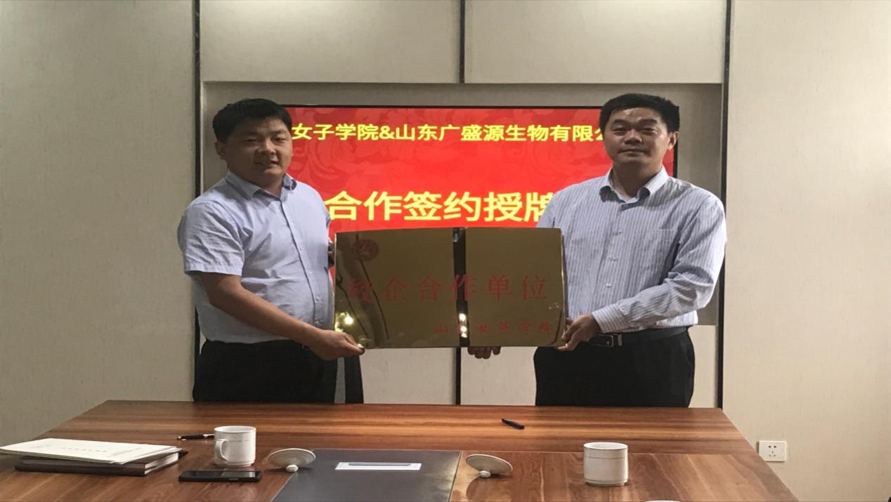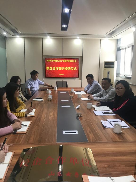 5月14日下午,学校科技产业管理处副处长杨洋、经济学院院长沈传河、副院长田玉丽、国贸教研室副主任郭华一行赴山东广盛源生物科技有限公司,在现场举行了校企合作签约授牌仪式,并同公司总经理林洪军等企业领导进行了座谈交流。