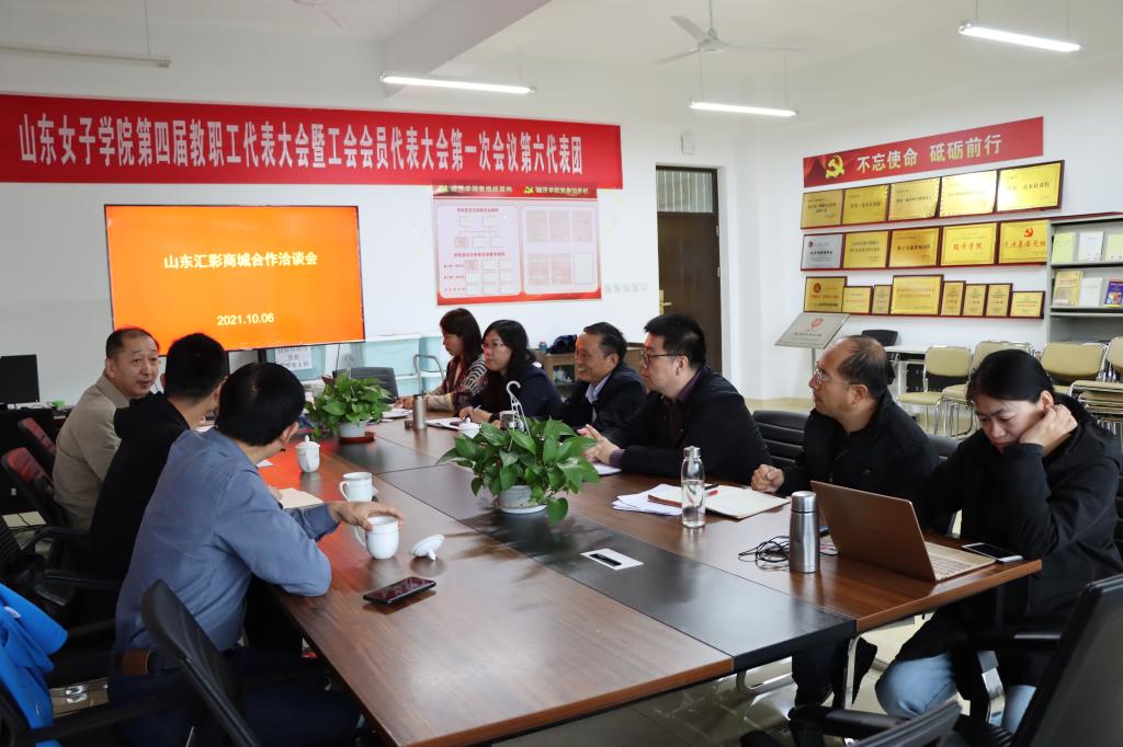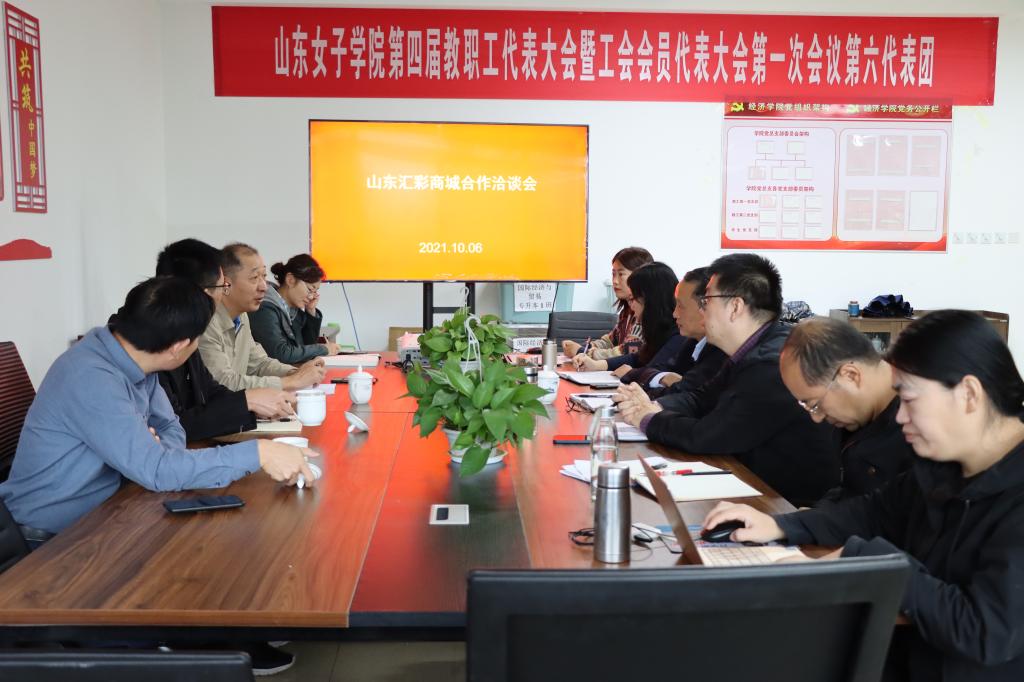 2021年10月6日,山东女子学院与山东汇彩商城召开了校企合作洽谈会,山东汇彩信息技术有限公司总经理郭佩习、山东汇彩信息技术有限公司COO运营总监何建峰,学校科技产业管理处处长刘明、科技产业管理处副处长路宁,经济院长沈传河、副院长田玉丽、副院长冯亮、办公室主任张太乐、国贸教研室主任孙海洋、国际商务教研室主任周红云、关务与外贸服务教研室主任张欣欣参加了此次会议。