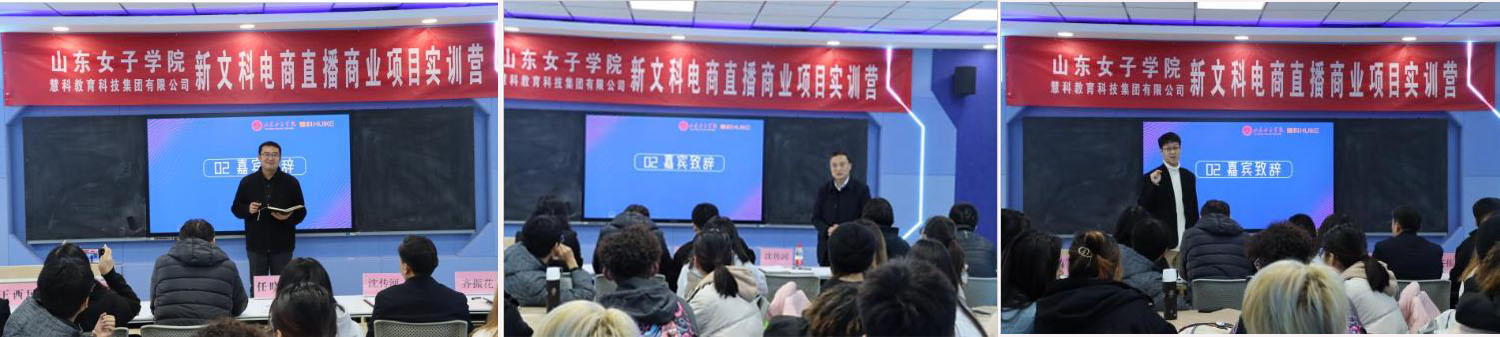 开营仪式上,任晓剑处长首先发表讲话,他指出,电商直播是科学技术竞争、人才竞争和教育竞争不断提高的产物,并以“1+3+N”为特色战略模式为例,提出“3个促进”,激励参训学生要对新文科电商直播商业项目充满信心,不断提高自身志气、骨气和底气。随后,吕慎敏副处长对慧科教育科技集团将我院作为训练营第一站表示感谢,同时介绍了担任主持人的我院优秀毕业生张慧敏,希望同学们能够以张慧敏为榜样,向其学习;也鼓励年轻教师在校企合作的过程中积极向企业工作人员学习,注重创新,勇于实践,提升能力和视野。接着,学院沈传河院长在讲话中指出,我校致力于建设应用型本科院校,着力于向高水平应用型女子大学发展,并要求同学们扎实学好专业知识,积极投身于实践,提高格局,塑造新时代大学生名片。最后,企业讲师就此次训练营的办学特色、教学师资进行了介绍,并鼓励参训学生抓住电商大环境和电商产业发展机遇,充分利用本次训练营的良好机会,开拓创新思维,努力提高自身能力,为电商产业发展贡献力量。