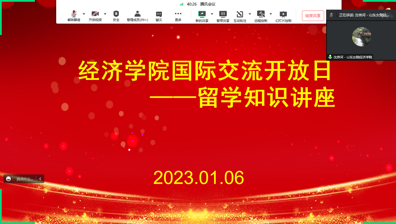 为开拓我院学生国际视野,了解留学相关信息,帮助同学做好留学规划,1月6日经济学院特邀AEC新澳移民教育中心的夏兴祥老师和张矛老师、英国北方大学联合会济南学习中心硕士项目负责人何昕奕老师为学院毕业班的学生开展线上留学知识专题讲座。经济学院党总支书记齐振花、院长沈传河、党总支副书记赵晓琳、副院长冯亮以及教研室主任、毕业班辅导员、学院2023届毕业生参加了讲座。