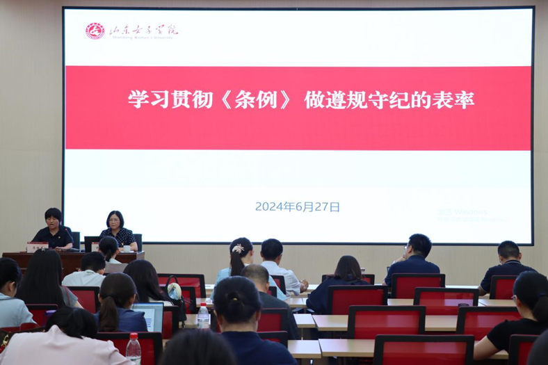 在求真楼报告厅,杨恩红书记从深刻认识党纪学习教育的重要意义、准确把握新修订《条例》的鲜明特点、相关条款解读、学习贯彻《条例》,做遵规守纪的表率四个方面进行了深入浅出的讲解。通过讲解《条例》的修订背景、过程、主要内容以及如何贯彻落实等内容,让全体党员更加精准的把握《条例》的精神实质。同时,针对与党员干部工作生活密切相关的违规收送礼品礼金、以讲课费等名义变相送礼、因私出国境管理、网络平台发布不当言论等条款,以案例剖析的形式进行深入解读,教育广大党员、干部明确行为底线,认识违纪代价,真正从内心重视、警醒、知止。她要求全体党员在党纪学习教育中,不仅要深刻理解《条例》的内容,更要在实际工作、学习中严格执行,确保《条例》规定的各项要求落到实处。