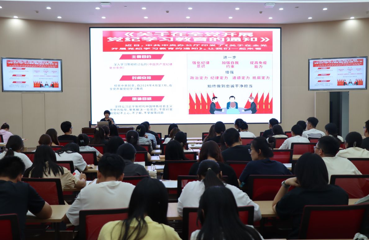 为深化毕业生党员的纪律意识,引导和鼓励广大毕业生党员坚定理想信念,以饱满的热情和昂扬的斗志投身于祖国的建设中,2024年6月25日下午,经济学院党总支在求真楼报告厅为2024届毕业生党员开展了主题为“奋楫扬帆启新程,风清气正赴新征”的行前教育,学院党总支书记齐振花、学生第二党支部书记杨辰兴和全体学生党员参加,会议由学院组织员、学生第一党支部书记戴晓艺同志主持。