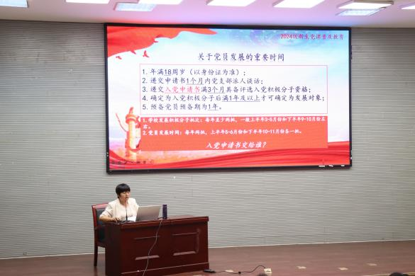学生第一党支部书记戴晓艺同志带领2024级全体本科新生通过回顾党的奋斗历史,深刻阐述了理想信念在中国共产党百年奋斗历程中的重要作用。同时,她详细讲解了入党相关流程,强调加入中国共产党是青年学生追求进步、服务人民的重要途径,同学们应当积极向党组织靠拢。最后,她希望同学们能将本次的学习成果转化为实际行动,将个人理想融入祖国的发展建设中,肩负起时代赋予的重任。