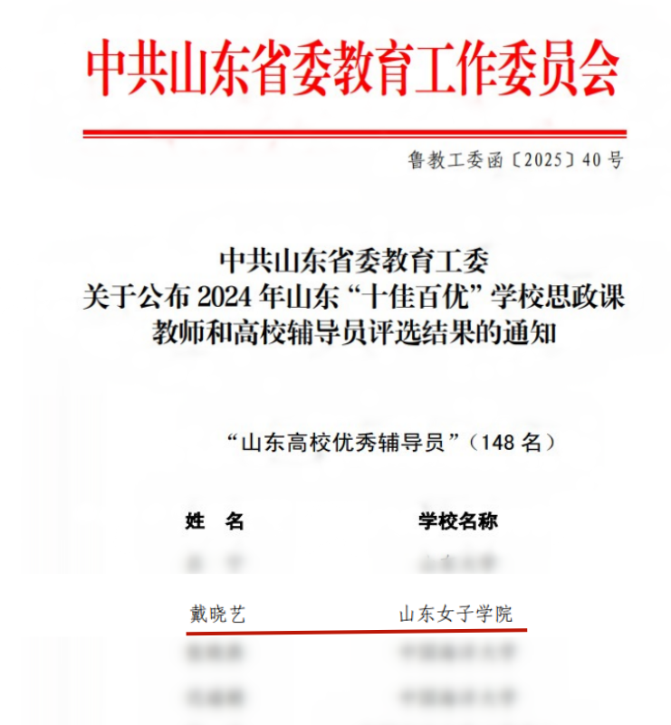 近日,中共山东省委教育工作委员会公布了2024年度山东“十佳百优”学校思政课教师和高校辅导员评选结果。经济学院辅导员戴晓艺获评“山东高校优秀辅导员”称号。