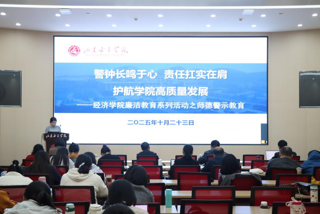 为深入学习贯彻习近平新时代中国特色社会主义思想,全面落实习近平总书记关于教育的重要论述和指示批示精神,坚持师德师风第一标准,2025年10月23日,经济学院组织开展了“以教育家精神铸魂强师,谱写教育强国建设华章”为主题的师德师风教育系列活动。学院班子成员和全体教师参加,由党委书记齐振花主持。活动结合上级部署与学院实际,设专题学习与警示教育两大环节。