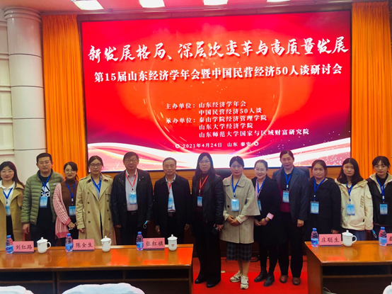 2021年第十五届“山东经济学年会”于2021年4月23-25日在山东省泰安市泰山学院经济管理学院召开。我校发展规划处处长刘中文、经济学院院长沈传河、经济学院副院长田玉丽及7名经济学院教师赴泰安参加了本次年会。本次年会由山东经济学年会、中国民营经济50人谈联合主办,主题为“新发展格局、深层次变革与高质量发展”,同时进行了经济学各专业领域的交流研讨。