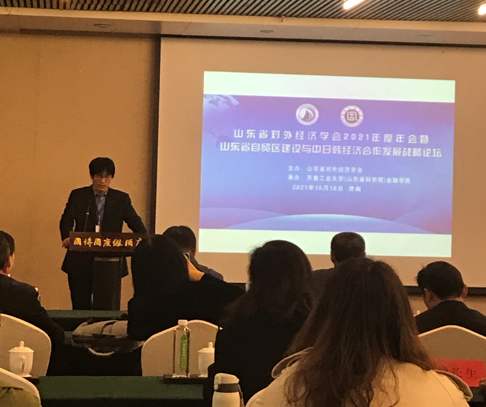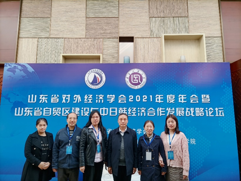 2021年度山东省对外经济学会年会暨山东省自贸区建设与中日韩经济合作发展战略论坛于2021年10月16日在济南市长清区园博园度假酒店召开。经济学院院长院长沈传河、副院长田玉丽、国际经济与贸易教研室主任孙海洋、教授赵蕾、国际商务教研室主任周红云、关务与外贸服务教研室主任张欣欣参加了会议。
