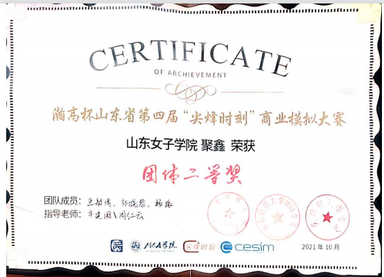 本次大赛由尖烽时刻组委会,山东财经大学MBA学院,山东财经大学工商管理学院主办,济南华峻科技有限公司、瀚高基础软件有限公司承办,芬兰CESIM公司技术支持。比赛自2021年9月23日开始,来自省内21所高校的124支队伍参加了此次比赛,最终共有20支队伍进入山东省赛决赛。决赛共计两天,分为模拟比赛和商业演示环节,不仅考察同学们的数据分析和应用能力,更是对综合能力的考验。第一天集中进行6个回合决策模拟,第二天进行商业汇报与答辩。在比赛中,山东女子学院代表队成员相互配合,以整体战略为核心,结合专业知识理性分析市场数据,科学决策,全方位掌控,案例分析环节,代表队成员结合商业模型,站在未来洞察未来,缜密深入地对比赛案进行了分析,以超强的逻辑思维和具有生命力的商业模式赢得评委的高度赞扬,最终斩获山东省二等奖。