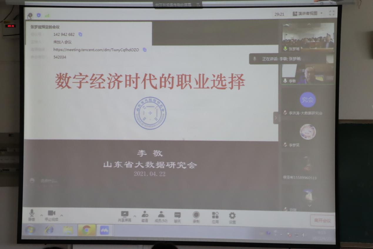 2022年4月23日上午,经济学院与山东省大数据研究会联合举办“数字经济时代下的职业选择”职业发展讲座。本次讲座在博文楼410、408教室开设线下会场,面向经济学院、旅游学院等相关专业的学生开展。山东省大数据研究会会长、山东大学金融研究院副院长石玉峰教师,山东省大数据研究会秘书长、党支部书记李敬、副秘书长尹刚、李洪涛,经济学院院长沈传河,副院长冯亮、崔俊富出席了本次讲座。讲座由冯亮主持。