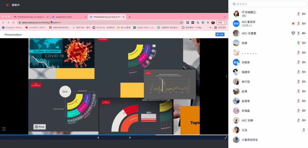 本次Demo class课程以“疫情下的全球经济发展(Global Economy(COVID-19))”为主题,分为数据分析、数据可视化展示和成果展示演讲三个环节。在主讲教师Lei Hua的引导下,同学们积极参加各项环节。从活动开始与主讲老师的互动,到活动中期勇于回答问题,敢于表达自己的观点,都保持了课堂的活跃度,使得活动在欢快的气氛中有序进行。从学生们的演讲来看,同学们前期都做了大量的准备工作,对图表分析精准、观点表达明确,英语口语能力也有了一定程度的提高。本次活动同学们积极参与进来,充分调动了同学们的积极性,营造了良好的课堂氛围。