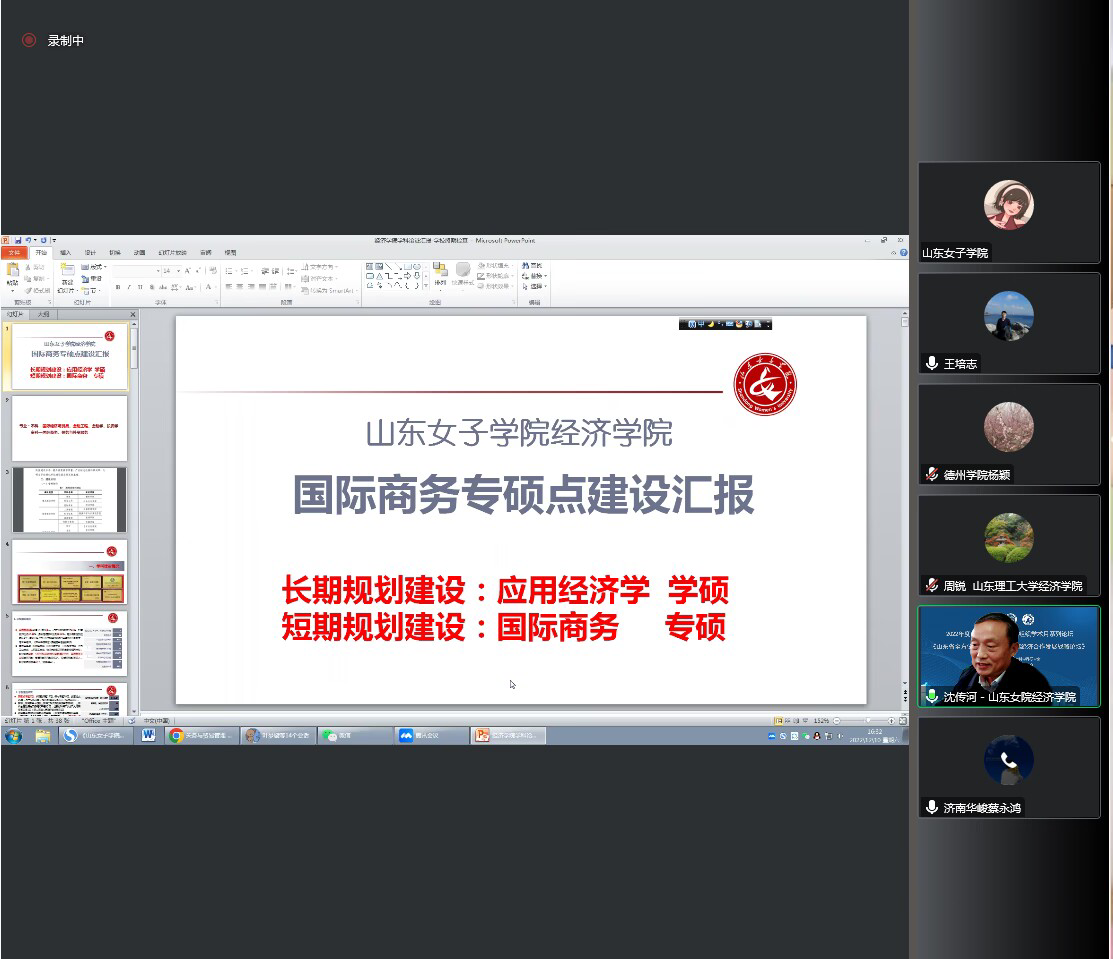 会上,沈传河就山东女子学院经济学院拟申报的国际商务专硕点的建设情况向与会专家学者进行了汇报交流。沈传河从学院的发展历程、专业设置情况、师资队伍情况、学科建设情况、未来发展规划等方面进行了详细的介绍,使与会专家学者充分了解了经济学院国际商务专硕点建设的基础和可行性。
