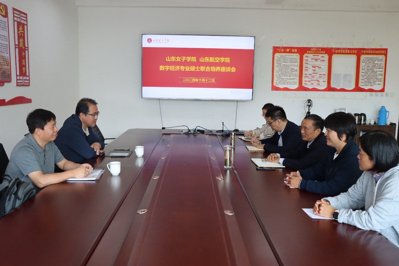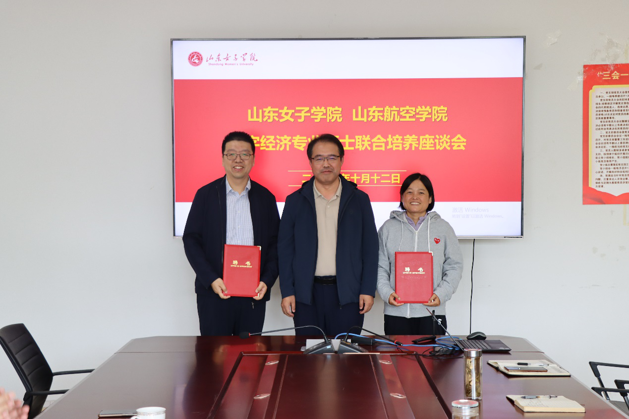 座谈会上,经济学院院长沈传河首先介绍了学院学科建设以及数字经济专业硕士点的筹建情况。随后,王春晖院长介绍了山东航空学院经济管理的发展现状以及山东航空学院数字经济专业硕士点的建设历程。之后,王春晖院长向山东女子学院经济学院冯亮教授、孙颖教授颁发了山东航空学院数字经济专业硕士生指导教师聘书。最后,双方就两个学院建立数字经济专业硕士联合培养基地以及在学科建设方面的合作等相关事宜进行了洽谈。