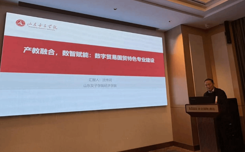 本次研讨会设立两个分论坛,第一分论坛以“高水平对外开放”为主题,探讨了新能源汽车产业国际竞争力、跨境电商与企业创新等议题;第二分论坛聚焦“学科发展与教学成果研讨”,交流了数字贸易赋能专业建设、跨境电商复合型人才培养等经验。经济学院沈传河院长受邀在第二分论坛进行了题为《产教融合、数智赋能:数字贸易国贸特色专业建设》汇报,就国际经济与贸易专业人才培养模式的探索实践、创新点及取得的成效等进行了详细介绍,赢得了与会专家的一致好评。