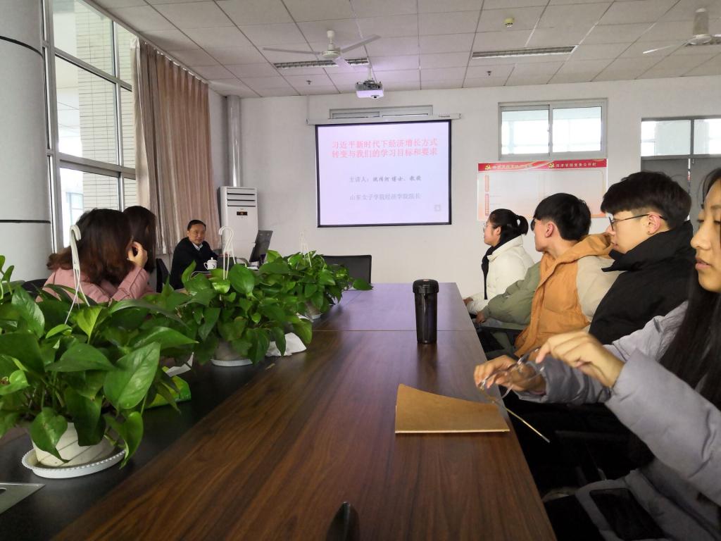 沈传河院长从解读《习近平新时代中国特色社会主义思想三十讲》中第十三讲的“实现我国经济质量发展”核心内涵出发,用生动的贴近生活的事例讲解了市场经济和计划经济,同时提出了经济发展引起的环境破坏和资源的浪费对人们健康的影响。随后,沈院长根据山东省现状描述了山东省新旧动能转换工程的战略思想与发展机遇,讲解了中国由粗放经济发展转入供给侧结构性和经济发展新常态的迫切要求。最后,沈院长立足我院发展,分析我院学生如何应对服务经济社会发展的新要求,提出经济学院专业人才培养的几点要求。会议最终,由党总支副书记齐振花做总结,她教导学生要做新时代的大学生,在努力学习专业知识的同时,关注经济发展,了解社会大事,提高自身综合素养。
