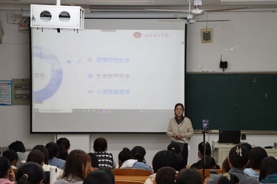首先,辅导员何老师就大学生疫情防控安全、生命财产安全、心理健康等问题出发,为同学们介绍了大学生须知的安全知识,帮助同学们提高辨别常见的诈骗方式的能力,掌握安全技能,提升安全素养,树立高度的安全意识。随后,何老师讲述了心理健康的具体内涵与心理健康的灰色带理论,重点强调了心理健康教育对于人们的重要性,并指出同学们来到新环境难免会出现一些心理上的不适,鼓励同学们积极进行心理咨询。最后,她向同学们说明了心理问题的危害性和严重性,强调了学院将继续关注每一位学生的身心健康,争取做到使每一位学生都拥有健康的心态。