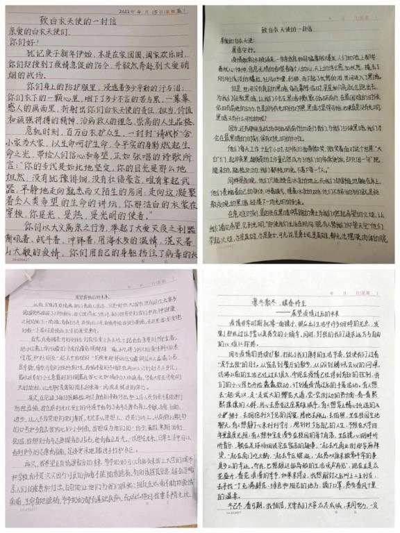 “致白衣天使的一封信”中歌颂着英雄们“疫”不容辞、冲锋在前的身影,默默坚守在抗疫幕后的故事,以平凡之躯披坚执锐、用实际行动诠释责任担当的画面;“抗疫志愿服务心得体会”中展现着疫情局势下的志愿服务精神和催人奋进的新时代正能量;“展望疫情过后的未来”表达了每为同学都渴望尽快走出这段灰暗时光的期盼,同时在这一特殊的时间段里同学们对生活与学习又有了新的感悟。同学们用手中的笔、热腾的心,定格身边的画面,写下一篇篇富有真知灼见、真情实感的好文章。