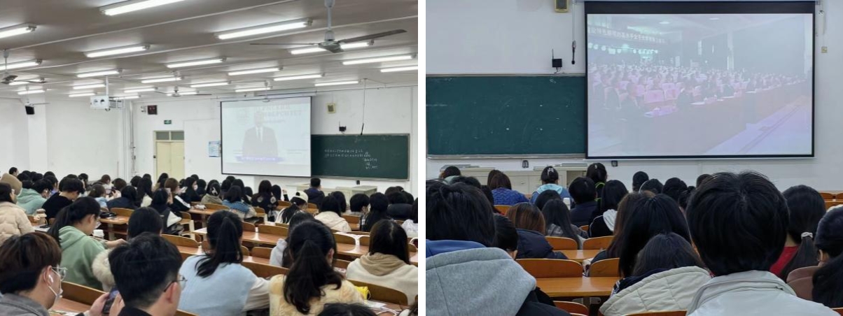 庆祝大会开始前,经济学院党总支书记齐振花深情讲述了学校的奋斗历史,将一代代女院人抢抓机遇、百折不挠、不断攀登的创业史、奋斗史娓娓道来。回望历史,展望未来,她说道,建校70周年是学校发展史上的里程碑,同时也是开创美好未来、建设百年女大的新起点,号召老师们按照学校“十四五”事业发展规划确定的目标任务,为加快建设特色鲜明的高水平应用型女子大学而不懈努力。接着,与会老师集体学习了二十大精神,更加坚定了永远跟党走、奋进新征程的信心和决心。在集体收看庆祝大会之前,老师们还一起观看了校庆宣传片。2022级全体同学在博文楼408、410教室,求真楼515教室组织集中收看庆祝大会,其余同学以班级为单位通过线上集中收看庆祝大会。