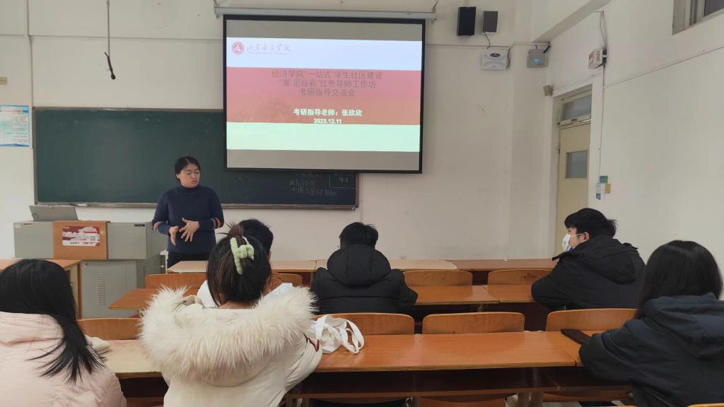 12月12日中午,经济学院在博学113举办了“一站式”学生社区建设“‘寓’见经彩”红色导师工作坊考研指导交流会。会议由考研导师张欣欣主讲,部分21级国际经济与贸易的同学参加。