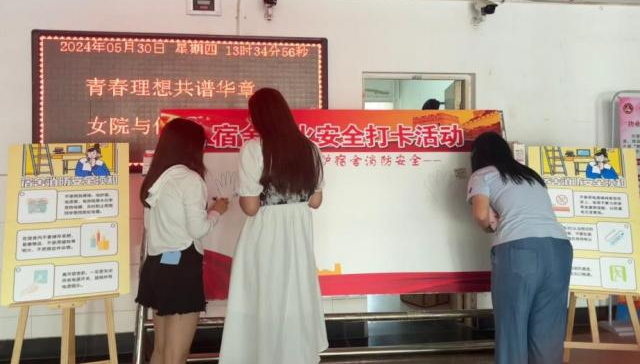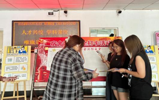 活动现场,在一号楼公寓大厅内设置了“打卡墙”和“标语墙”两大板块的消防安全打卡板,这种创意互动的方式以简单的形式引起大家的广泛的关注,吸引了众多同学的参与。