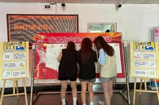 同学们在“打卡墙”上用马克笔绘制掌印并签名,写下的不仅是一个个简单的名字,更是同学们对消防安全的一份承诺,这时刻提醒着同学们要关注防火安全,预防宿舍火灾隐患。而“标语墙”则是写下对宿舍防火安全的感悟,营造了安全文化氛围,让同学们更加深刻地认识到防火安全的重要性。此外,活动现场摆放了涵盖火灾预防、应急逃生等内容详实的消防安全宣传手册,供同学们随时取阅。同时,自律会和学管会学生干部也积极向同学们发放宣传资料,为同学们讲解防火常识与遇火应对措施。